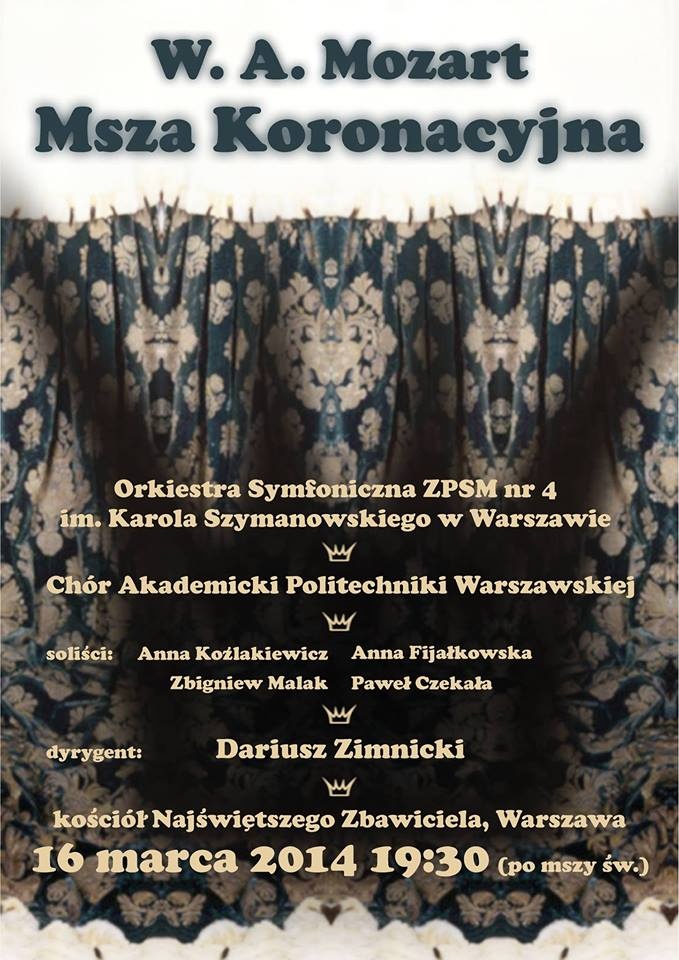 16 marca 2014 r. w Kościele Najświętszego Zbawiciela w Warszawie o godz. 19:30 (po Mszy Świętej) wspólnie ze znakomitymi artystami, wykonamy Mszę Koronacyjną C-dur Wolfganga Amadeusza Mozarta. Wykonawcy: Orkiestra Symfoniczna ZPSM nr 4 im. Karola Szymanowskiego w Warszawie Chór Akademicki Politechniki Warszawskiej Soliści: Anna Koźlakiewicz Anna Fijałkowska Zbigniew Malak Paweł Czekała Dyrygent: Dariusz Zimnicki Serdecznie zapraszamy!