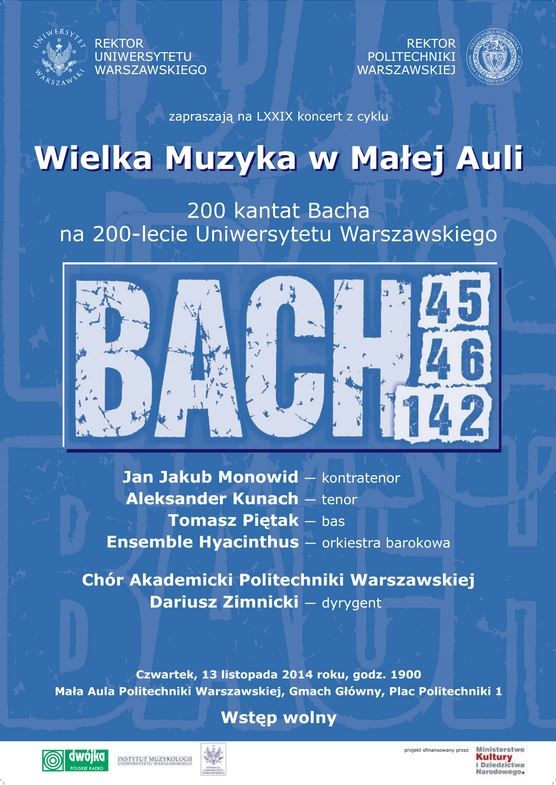 Rektorzy Uniwersytetu Warszawskiego i Politechniki Warszawskiej zapraszają na ostatni w tym roku koncert „BACH 200 UW – 200 kantat Bacha na 200-lecie Uniwersytetu Warszawskiego” – zarazem LXXIX koncert cyklu „Wielka Muzyka w Małej Auli”. W czwartek, 13 listopada 2014 r., w Małej Auli Politechniki Warszawskiej wystąpi Chór Akademicki Politechniki Warszawskiej z towarzyszeniem orkiestry barokowej Ensemble Hyacinthus i solistów – Jana Jakuba Monowida (kontratenor), Aleksandra Kunacha (tenor) i Tomasza Piętaka (bas), pod dyrekcją Dariusza Zimnickiego. Usłyszymy kantaty BWV 45 Es ist dir gesagt, Mensch, was gut ist, BWV 46 Schauet doch und sehet, ob irgendein Schmerz sei oraz BWV 142 Uns ist ein Kind geboren. Wstęp na koncert jest wolny. Koncert organizowany jest przez Fundację Uniwersytetu Warszawskiego oraz Biuro Promocji UW we współpracy z Politechniką Warszawską i Instytutem Muzykologii UW, pod patronatem medialnym Programu 2 Polskiego Radia. Koncerty cyklu „BACH 200 UW” w latach 2013–2015 odbywają się dzięki wsparciu Ministra Kultury i Dziedzictwa Narodowego. Politechnika Warszawska – Gmach Główny, Mała Aula (Plac Politechniki 1) 13 listopada 2014 r. (czwartek), godz. 19:00 Wielka Muzyka w Małej Auli – „BACH 200 UW” Wstęp wolny.